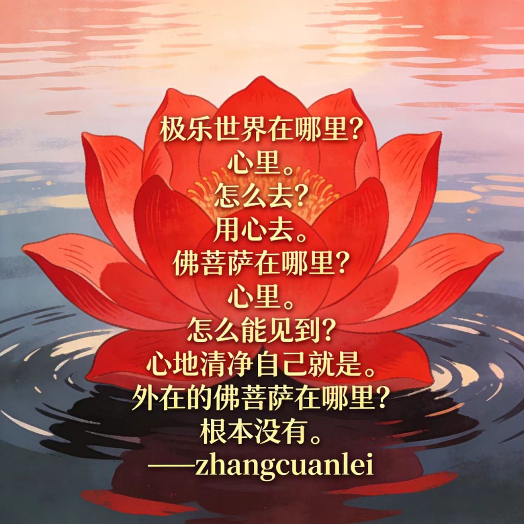 57.极乐世界在哪里?心里。怎么去?用心去。佛菩萨在哪里?心里。怎么能见到?心地清净自己就是。外在的佛菩萨在哪里?根本没有。