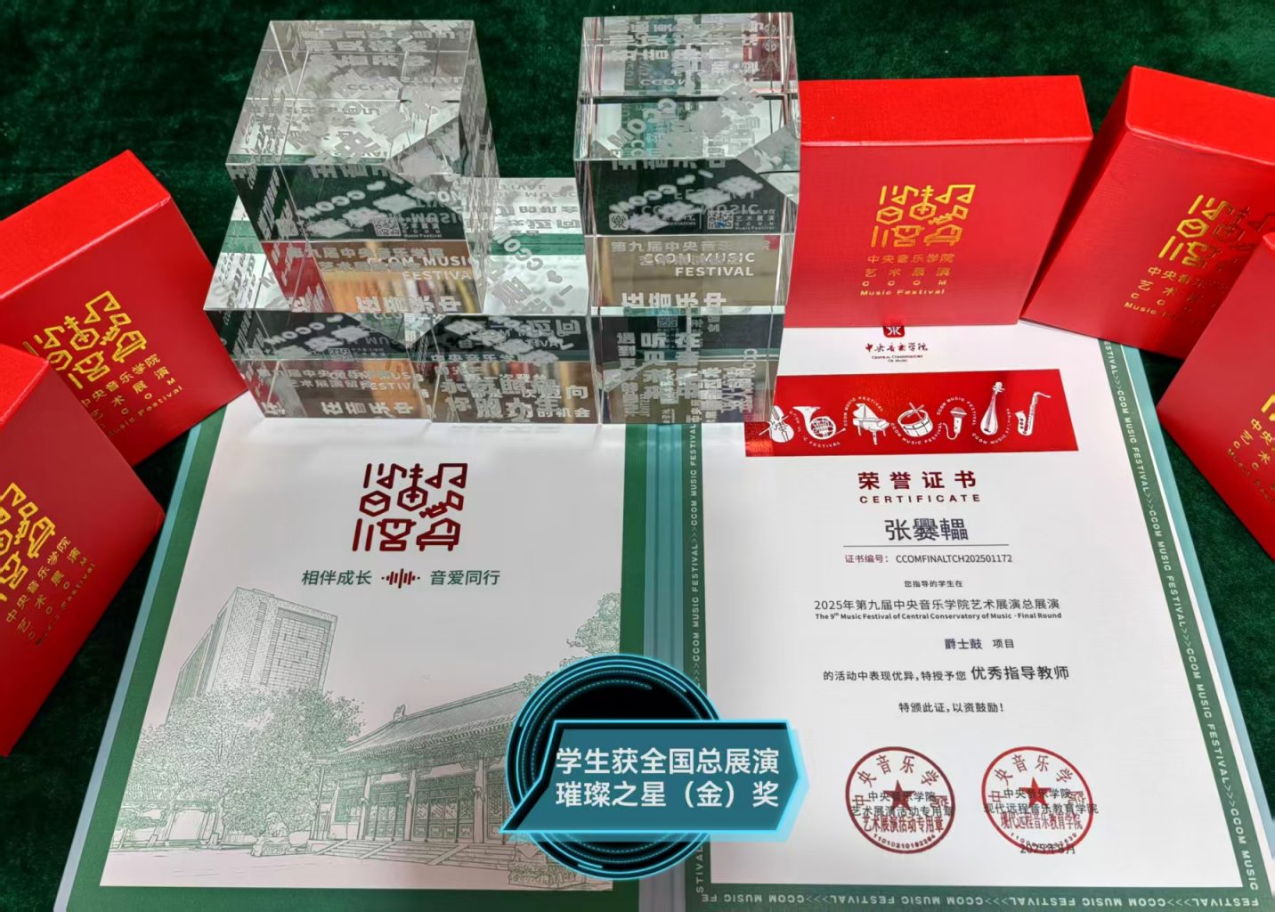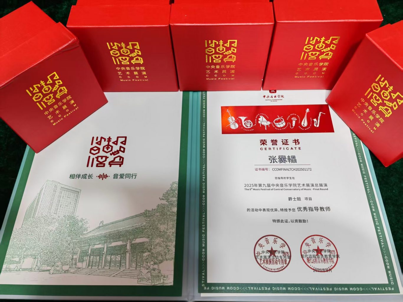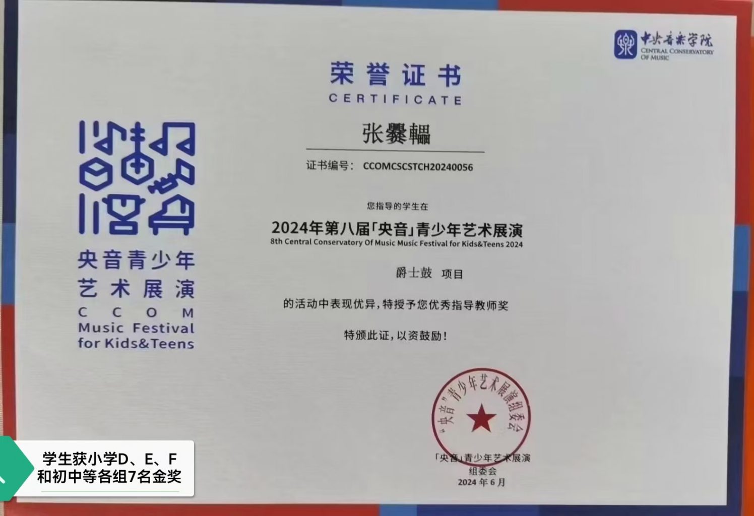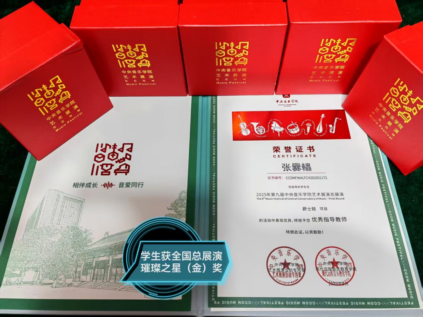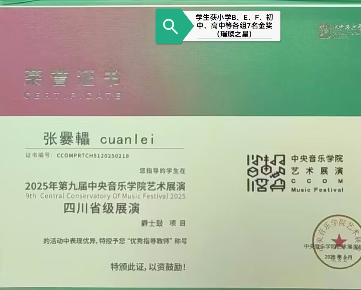 本次比赛派出10名学生在2025年7月第9届中央音乐学院艺术展演中分别获得四川省赛区爵士鼓小学B组、小学E组、小学F组、初中组、高中组各组金奖(璀璨之星)共7名;5名学生2025年8月进北京参加全国总展演获得金奖(璀璨之星)1名,银奖(闪耀之星)3名,铜奖(闪亮之星)1名;获全国总展演金奖(璀璨之星)学生演奏的曲目是《美好季节》(选自《2023夺冠曲集》);5名进京参加总展演学生分别演奏的曲目是《美好季节》(选自《2023夺冠曲集》)、《美好季节》(选自《2023夺冠曲集》)、《美好季节》(选自《2023夺冠曲集》)、《Festival de Ritmo》(选自《易丘比赛独奏曲》、《鲁邦三世》(选自《四川打击乐考级教程》)。7名获四川赛区金奖(璀璨之星)学生演奏的曲目分别是《美好季节》(选自《2023夺冠曲集》)、《美好季节》(选自《2023夺冠曲集》)、《美好季节》(选自《2023夺冠曲集》)、《鲁邦三世》(选自《四川打击乐考级教程》)、《Miles N Miles》(选自《易丘比赛独奏曲》)、《Funk》(选自《JAZZ DRUM DOMPETITTION FOR CHILDREN》、《Funk》(选自《JAZZ DRUM DOMPETITTION FOR CHILDREN》》。