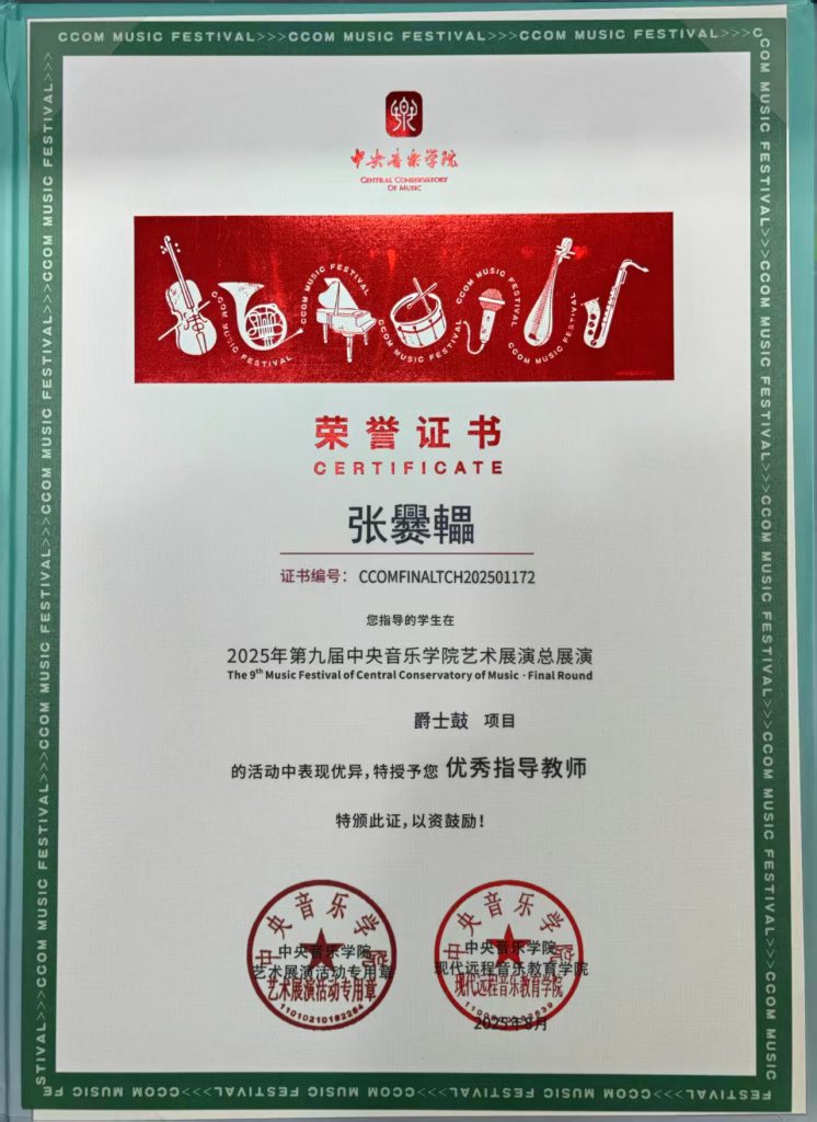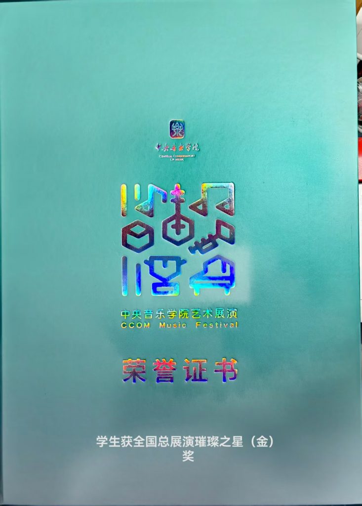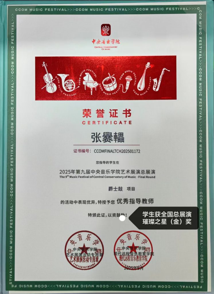 本次在2025年8月第9届中央音乐学院艺术展演中学生获全国总展演爵士鼓小学E组金奖(璀璨之星)